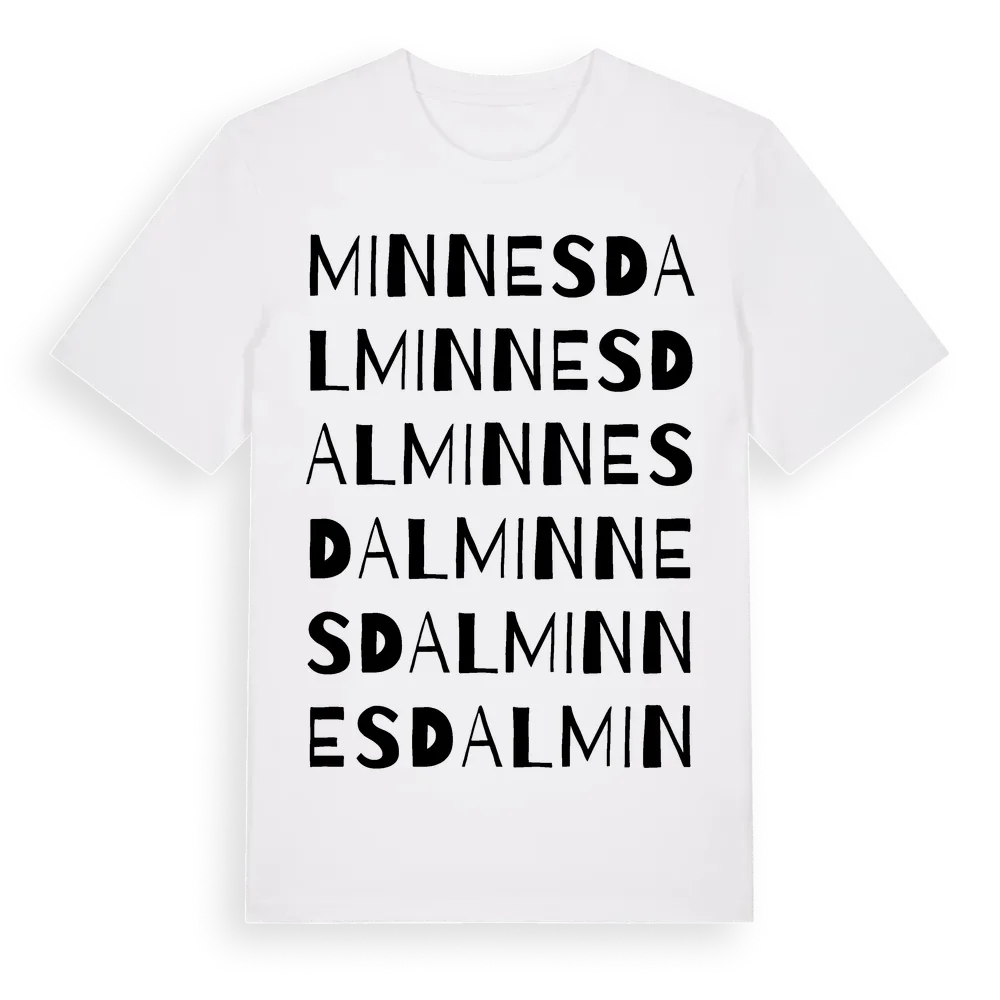Minnesdal ordlek t-shirt är inspirerad av Minnesdal i Skåne län, Sverige. Tröjan är designad för dig som har en speciell koppling till platsen – oavsett om du bor här, har rötterna här eller bara älskar Minnesdal.