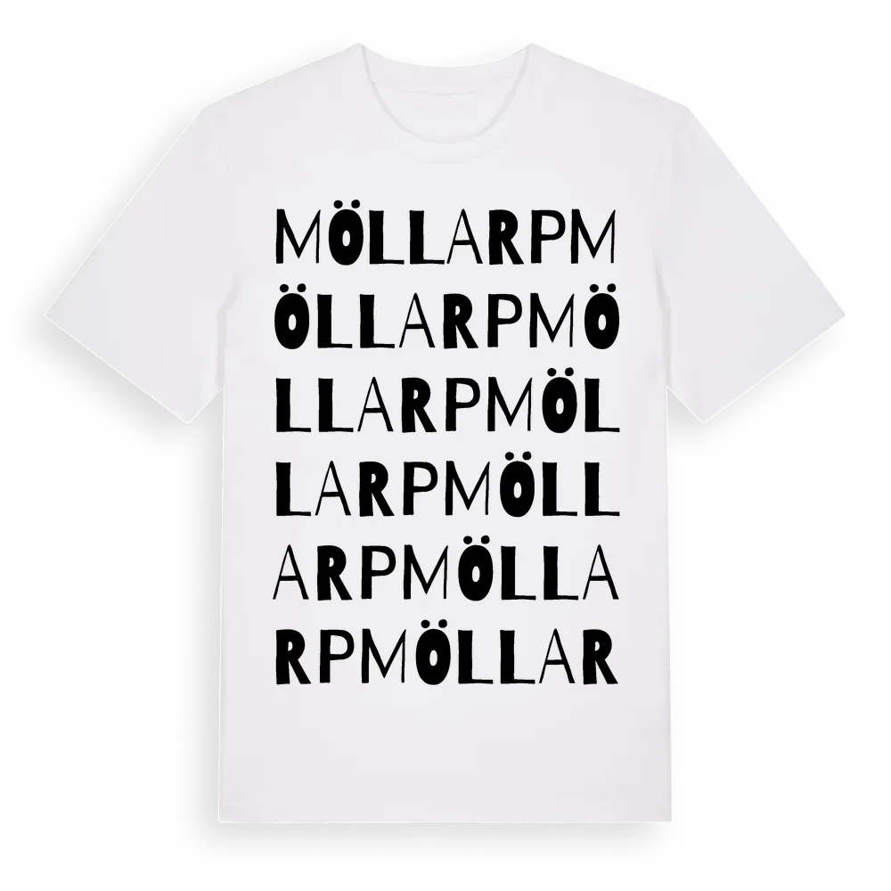 Möllarp ordlek t-shirt är inspirerad av Möllarp i Skåne län, Sverige. Tröjan är designad för dig som har en speciell koppling till platsen – oavsett om du bor här, har rötterna här eller bara älskar Möllarp.