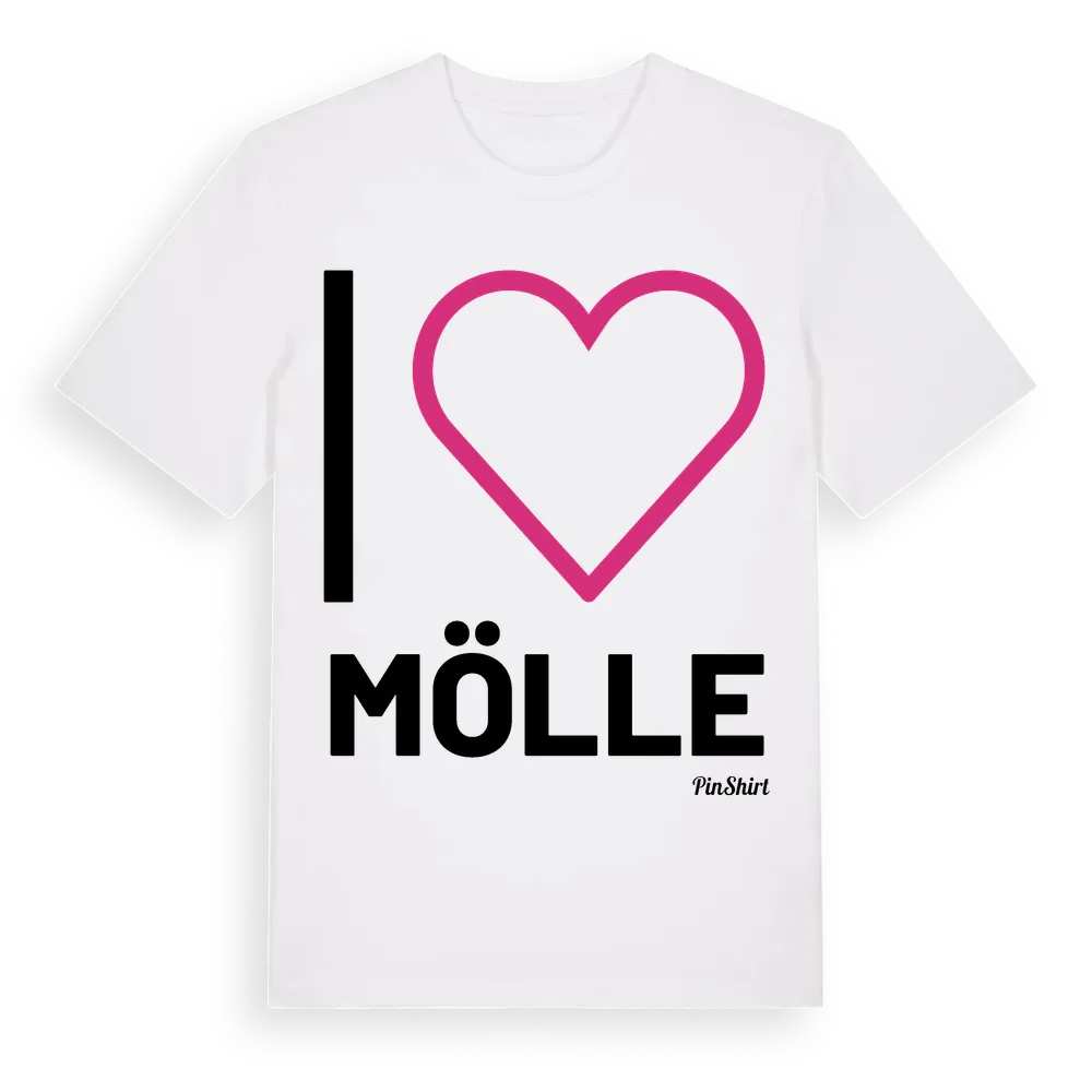 Det klassiska "I ❤ Mölle"-motivet i stort format som täcker hela bröstet. För dig som vill visa kärleken till Mölle på riktigt. Premium bomull, unisex – från byn Mölle i Skåne län.