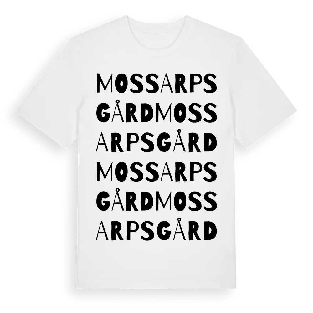 Mossarpsgård ordlek t-shirt är inspirerad av byn Mossarpsgård i Skåne län, Sverige. Tröjan är designad för dig som har en speciell koppling till platsen – oavsett om du bor här, har rötterna här eller bara älskar Mossarpsgård.