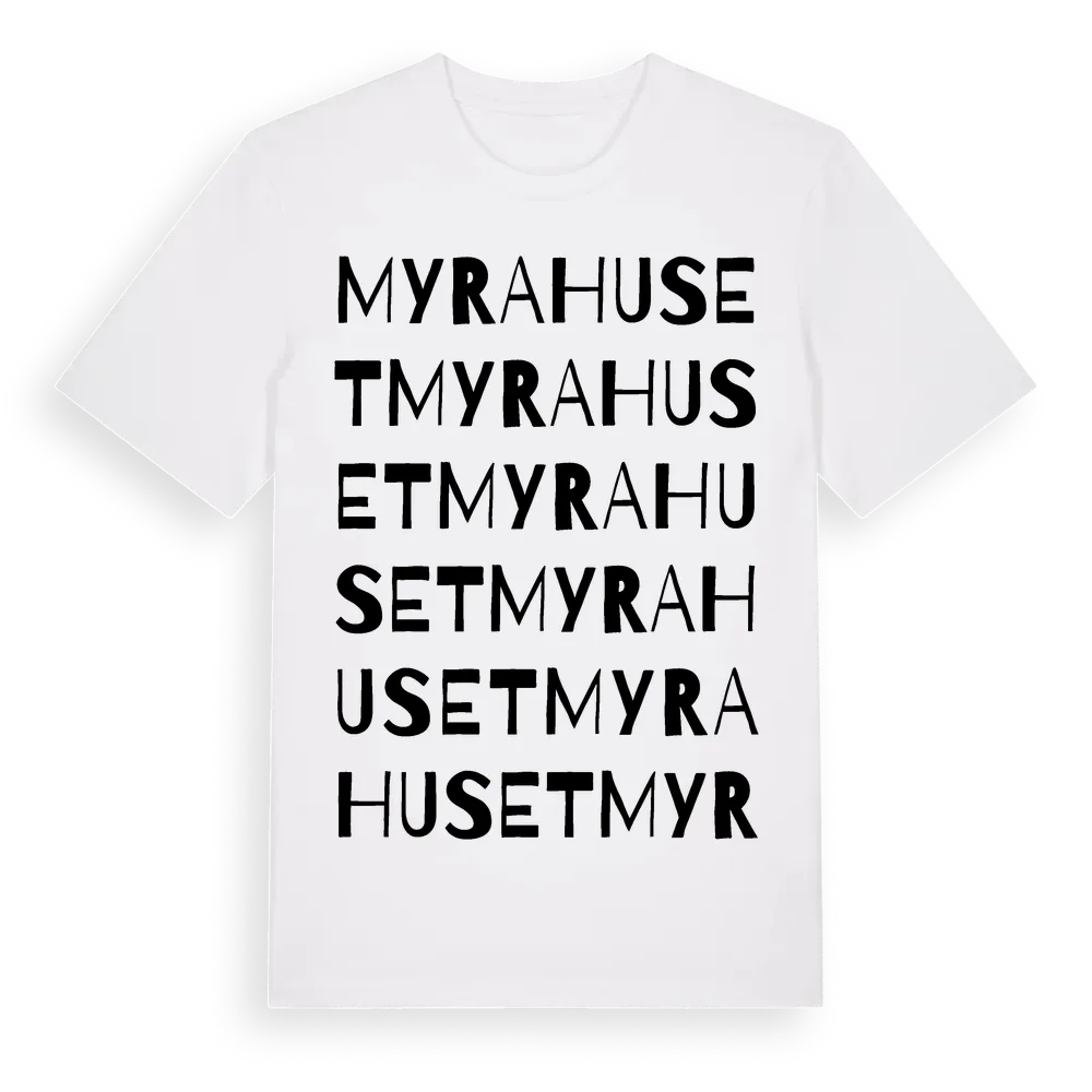 Myrahuset ordlek t-shirt är inspirerad av Myrahuset i Skåne län, Sverige. Tröjan är designad för dig som har en speciell koppling till platsen – oavsett om du bor här, har rötterna här eller bara älskar Myrahuset.