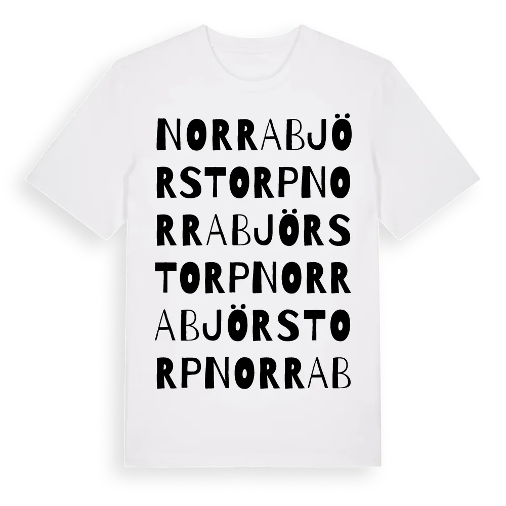 Norra Björstorp ordlek t-shirt är inspirerad av byn Norra Björstorp i Skåne län, Sverige. Tröjan är designad för dig som har en speciell koppling till platsen – oavsett om du bor här, har rötterna här eller bara älskar Norra Björstorp.