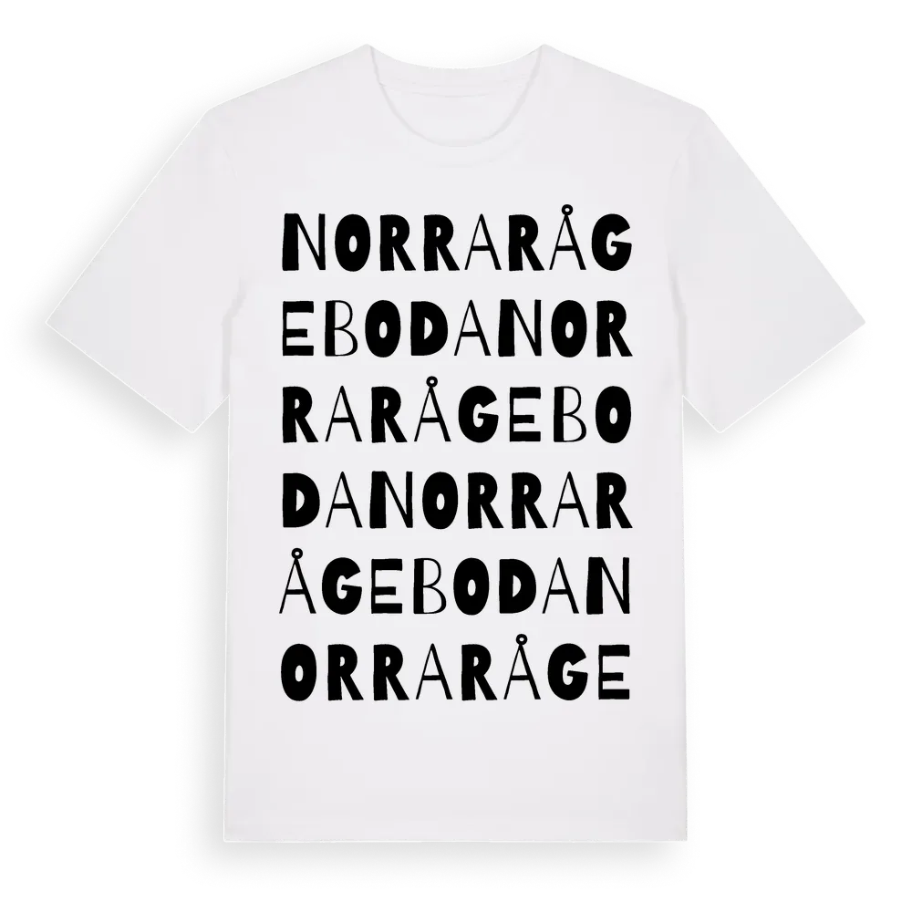 Norra Rågeboda ordlek t-shirt är inspirerad av byn Norra Rågeboda i Skåne län, Sverige. Tröjan är designad för dig som har en speciell koppling till platsen – oavsett om du bor här, har rötterna här eller bara älskar Norra Rågeboda.