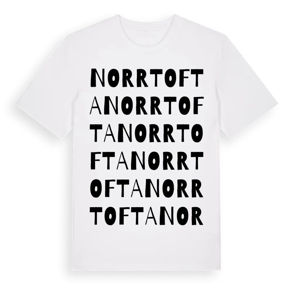 Norrtofta ordlek t-shirt är inspirerad av Norrtofta i Skåne län, Sverige. Tröjan är designad för dig som har en speciell koppling till platsen – oavsett om du bor här, har rötterna här eller bara älskar Norrtofta.
