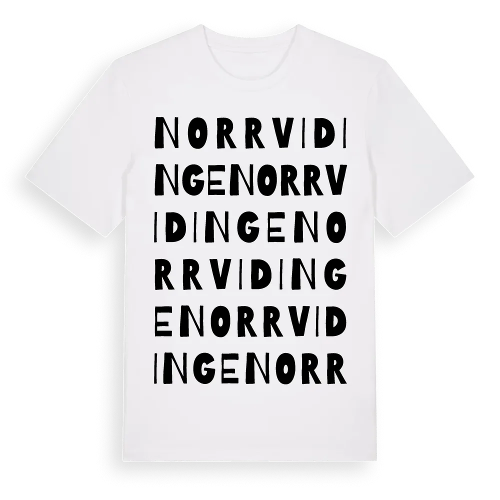 Norrvidinge ordlek t-shirt är inspirerad av byn Norrvidinge i Skåne län, Sverige. Tröjan är designad för dig som har en speciell koppling till platsen – oavsett om du bor här, har rötterna här eller bara älskar Norrvidinge.