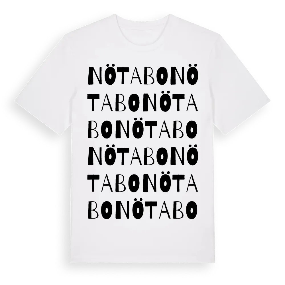 Nötabo ordlek t-shirt är inspirerad av byn Nötabo i Skåne län, Sverige. Tröjan är designad för dig som har en speciell koppling till platsen – oavsett om du bor här, har rötterna här eller bara älskar Nötabo.
