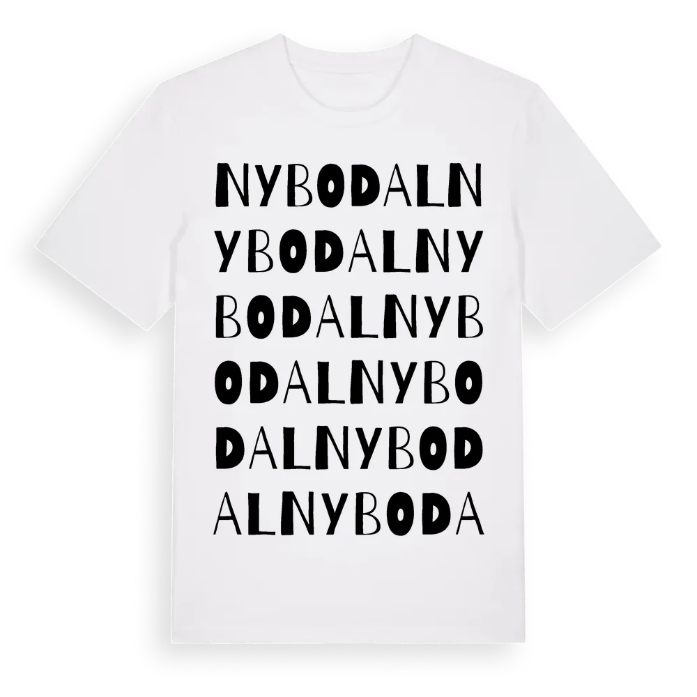 Nybodal ordlek t-shirt är inspirerad av Nybodal i Skåne län, Sverige. Tröjan är designad för dig som har en speciell koppling till platsen – oavsett om du bor här, har rötterna här eller bara älskar Nybodal.