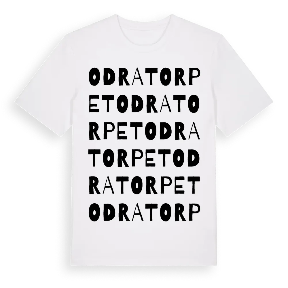 Odratorpet ordlek t-shirt är inspirerad av Odratorpet i Skåne län, Sverige. Tröjan är designad för dig som har en speciell koppling till platsen – oavsett om du bor här, har rötterna här eller bara älskar Odratorpet.
