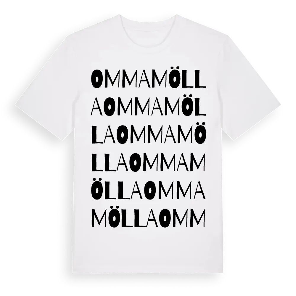 Ommamölla ordlek t-shirt är inspirerad av Ommamölla i Skåne län, Sverige. Tröjan är designad för dig som har en speciell koppling till platsen – oavsett om du bor här, har rötterna här eller bara älskar Ommamölla.
