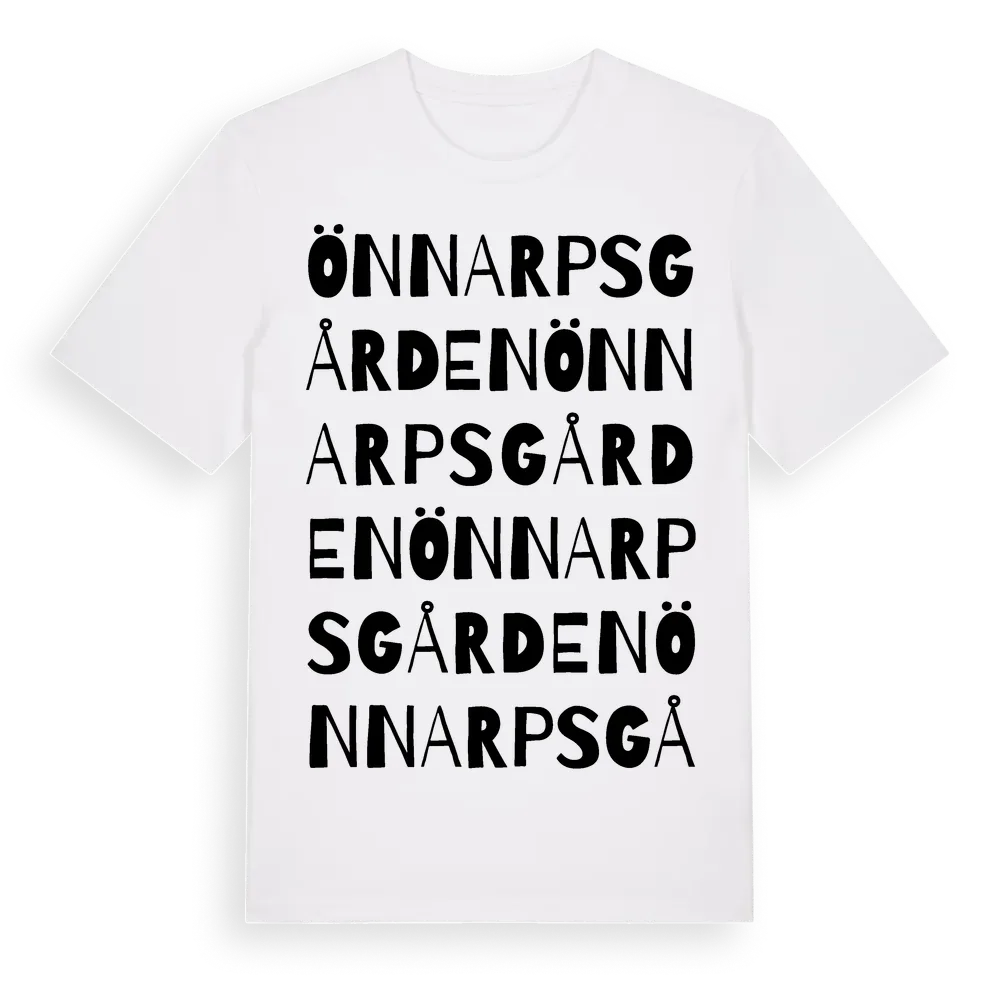 Önnarpsgården ordlek t-shirt är inspirerad av Önnarpsgården i Skåne län, Sverige. Tröjan är designad för dig som har en speciell koppling till platsen – oavsett om du bor här, har rötterna här eller bara älskar Önnarpsgården.