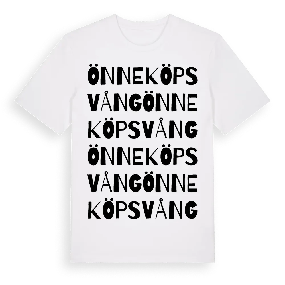 Önneköps Vång ordlek t-shirt är inspirerad av byn Önneköps Vång i Skåne län, Sverige. Tröjan är designad för dig som har en speciell koppling till platsen – oavsett om du bor här, har rötterna här eller bara älskar Önneköps Vång.