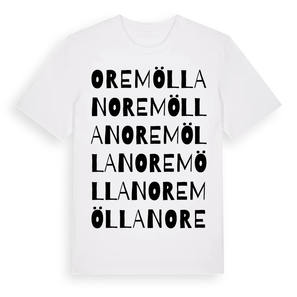 Oremöllan ordlek t-shirt är inspirerad av Oremöllan i Skåne län, Sverige. Tröjan är designad för dig som har en speciell koppling till platsen – oavsett om du bor här, har rötterna här eller bara älskar Oremöllan.