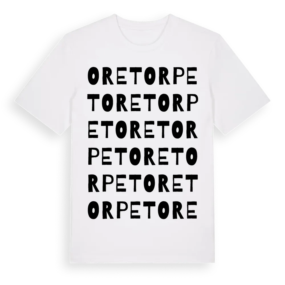Oretorpet ordlek t-shirt är inspirerad av Oretorpet i Skåne län, Sverige. Tröjan är designad för dig som har en speciell koppling till platsen – oavsett om du bor här, har rötterna här eller bara älskar Oretorpet.