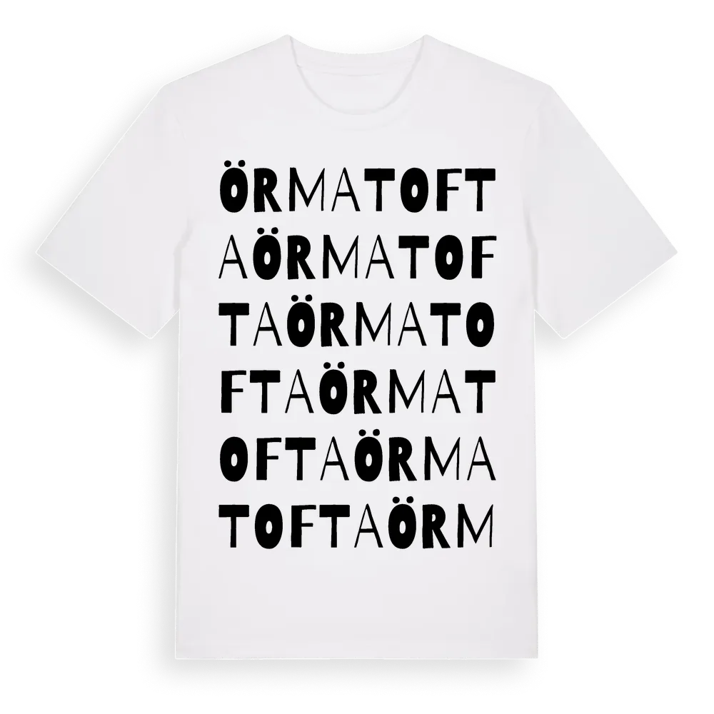 Örmatofta ordlek t-shirt är inspirerad av byn Örmatofta i Skåne län, Sverige. Tröjan är designad för dig som har en speciell koppling till platsen – oavsett om du bor här, har rötterna här eller bara älskar Örmatofta.