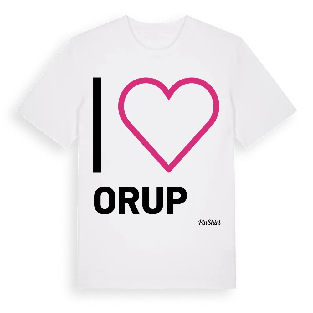 Det klassiska "I ❤ Orup"-motivet i stort format som täcker hela bröstet. För dig som vill visa kärleken till Orup på riktigt. Premium bomull, unisex – från byn Orup i Skåne län.