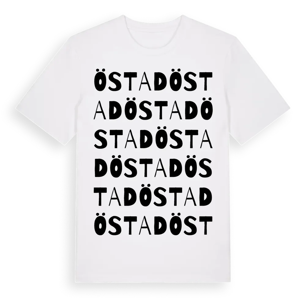 Östad ordlek t-shirt är inspirerad av byn Östad i Skåne län, Sverige. Tröjan är designad för dig som har en speciell koppling till platsen – oavsett om du bor här, har rötterna här eller bara älskar Östad.