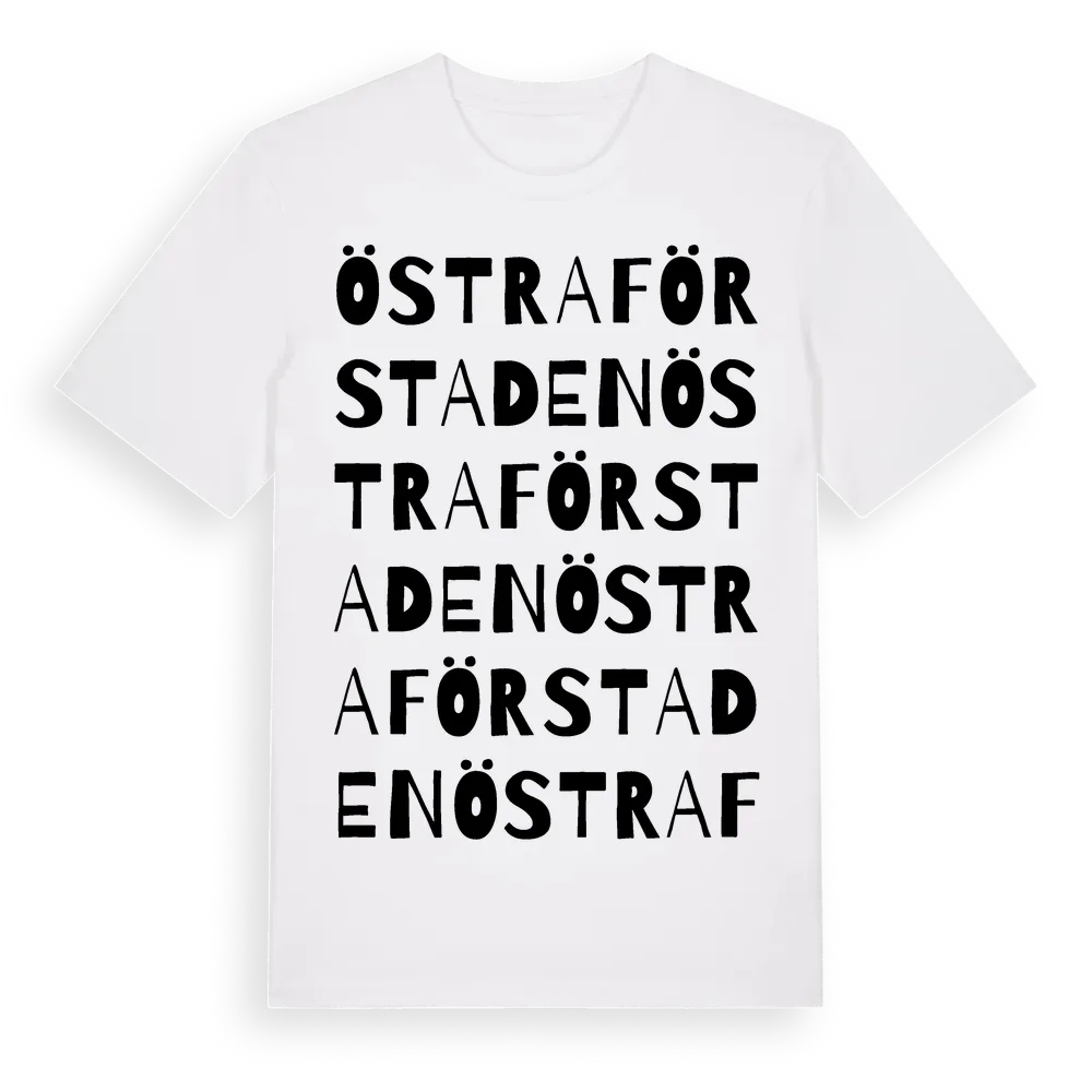 Östra Förstaden ordlek t-shirt är inspirerad av stadsdelen Östra Förstaden i Skåne län, Sverige. Tröjan är designad för dig som har en speciell koppling till platsen – oavsett om du bor här, har rötterna här eller bara älskar Östra Förstaden.