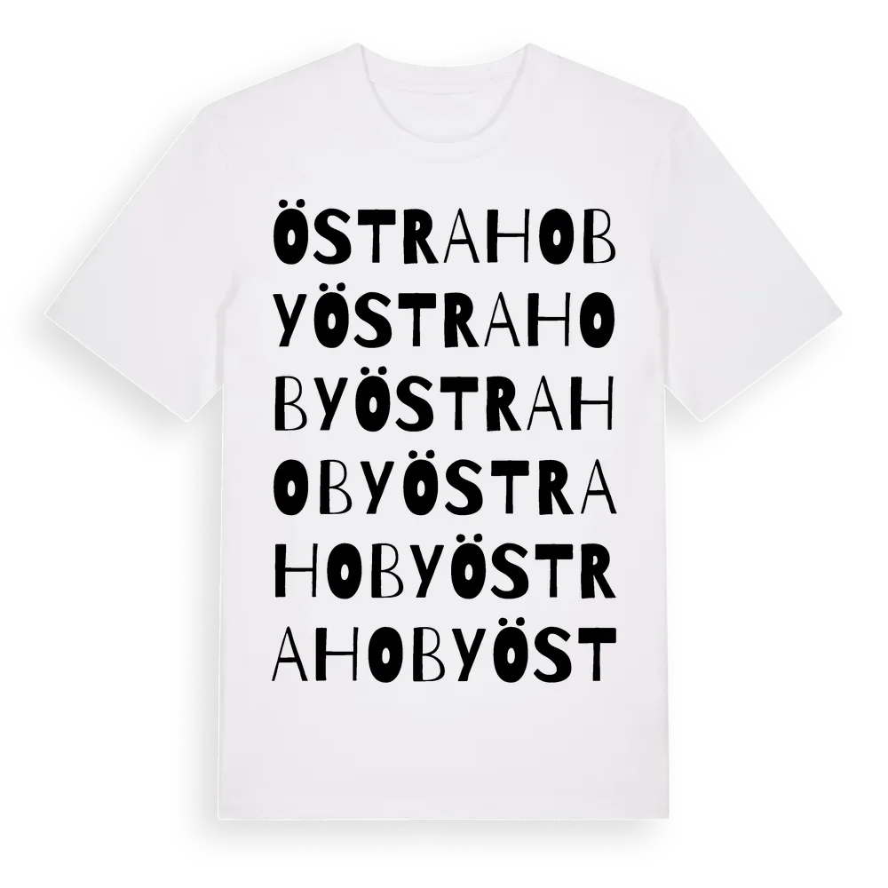 Östra Hoby ordlek t-shirt är inspirerad av byn Östra Hoby i Skåne län, Sverige. Tröjan är designad för dig som har en speciell koppling till platsen – oavsett om du bor här, har rötterna här eller bara älskar Östra Hoby.