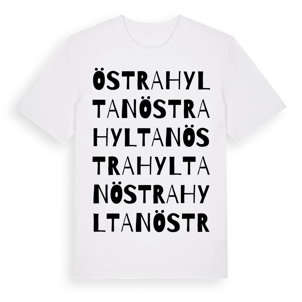 Östra Hyltan ordlek t-shirt är inspirerad av Östra Hyltan i Skåne län, Sverige. Tröjan är designad för dig som har en speciell koppling till platsen – oavsett om du bor här, har rötterna här eller bara älskar Östra Hyltan.