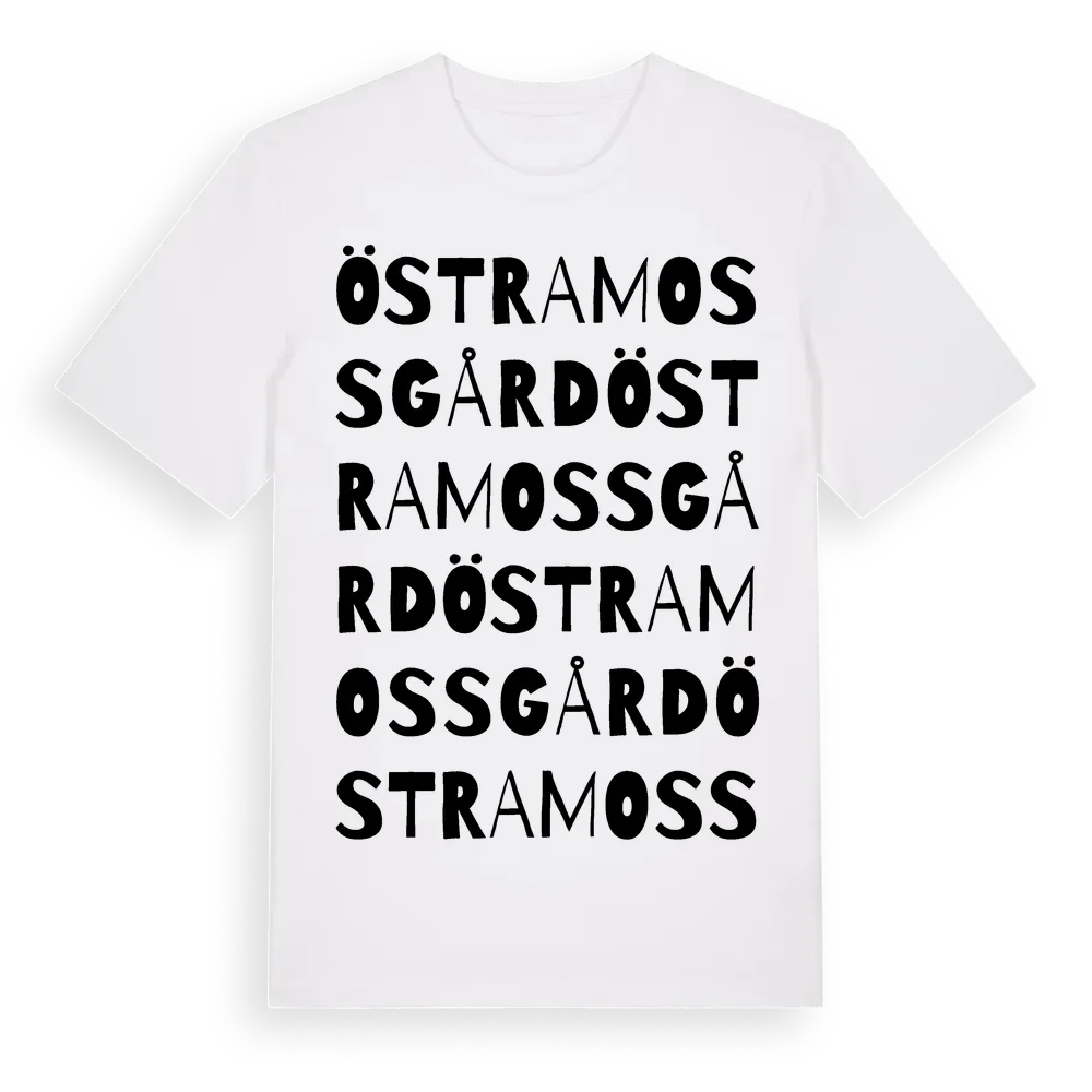 Östra Mossgård ordlek t-shirt är inspirerad av Östra Mossgård i Skåne län, Sverige. Tröjan är designad för dig som har en speciell koppling till platsen – oavsett om du bor här, har rötterna här eller bara älskar Östra Mossgård.