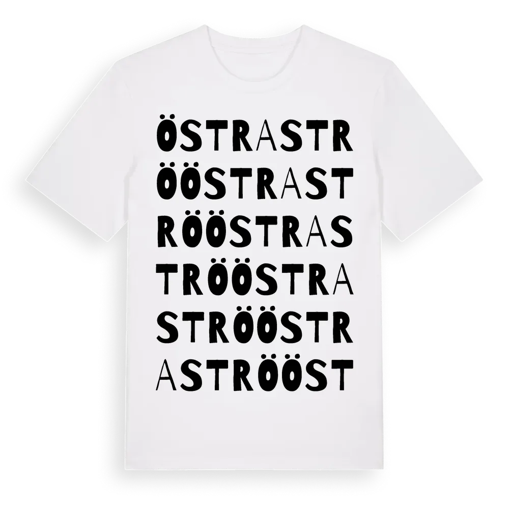 En ordlek byggd på Östra Strös namn. Subtilt och klurig – ett motiv som bara de som verkligen känner platsen fullt ut förstår. Premium bomull, unisex – från byn Östra Strö i Skåne län.