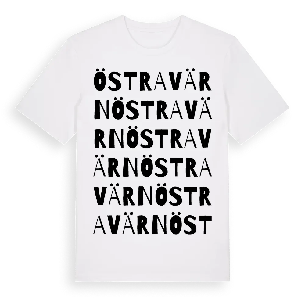 Östravärn ordlek t-shirt är inspirerad av stadsdelen Östravärn i Skåne län, Sverige. Tröjan är designad för dig som har en speciell koppling till platsen – oavsett om du bor här, har rötterna här eller bara älskar Östravärn.