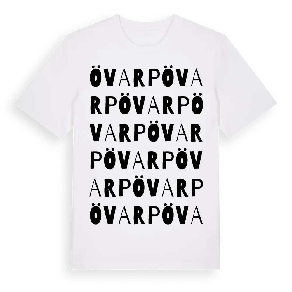 Övarp ordlek t-shirt är inspirerad av byn Övarp i Skåne län, Sverige. Tröjan är designad för dig som har en speciell koppling till platsen – oavsett om du bor här, har rötterna här eller bara älskar Övarp.