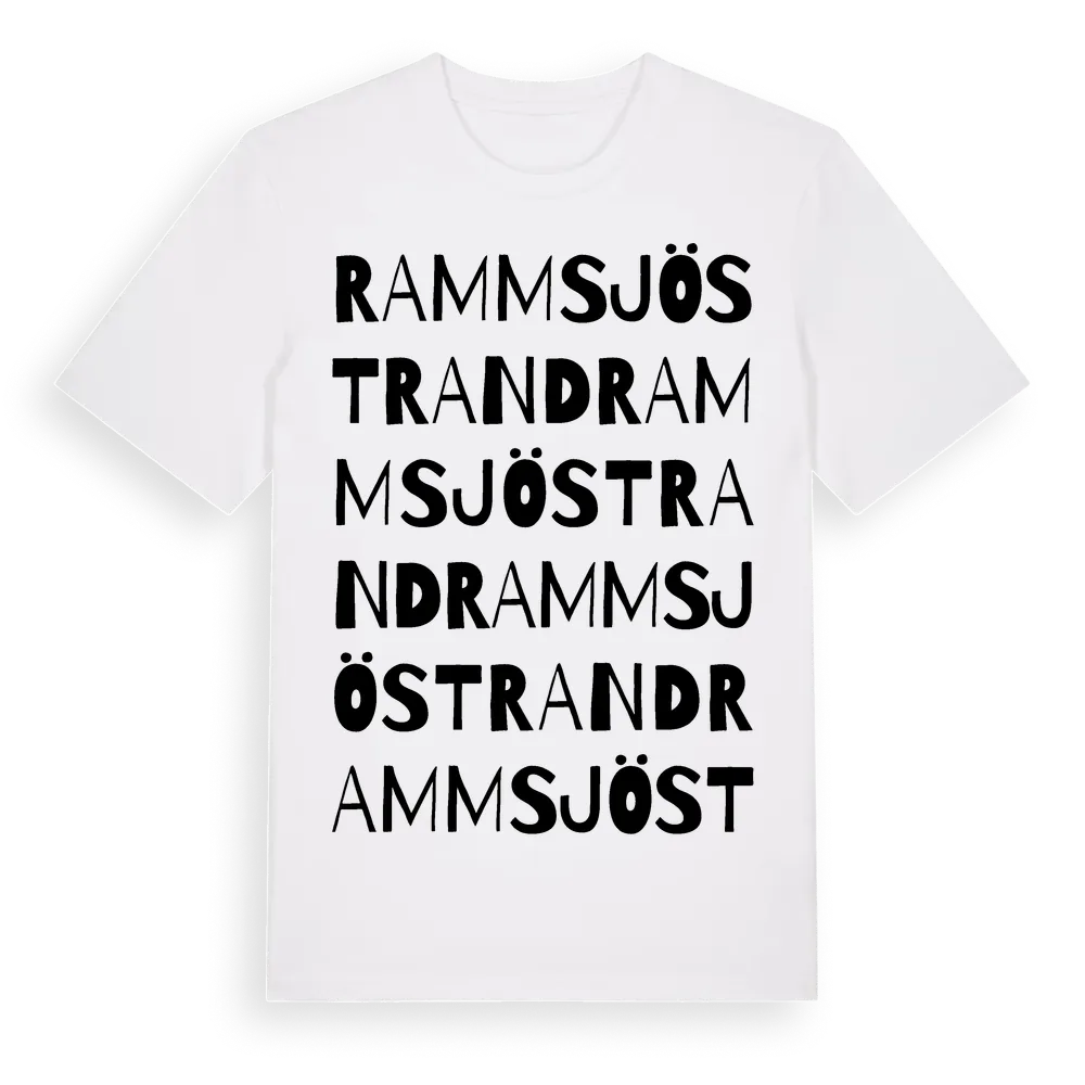 Rammsjöstrand ordlek t-shirt är inspirerad av byn Rammsjöstrand i Skåne län, Sverige. Tröjan är designad för dig som har en speciell koppling till platsen – oavsett om du bor här, har rötterna här eller bara älskar Rammsjöstrand.