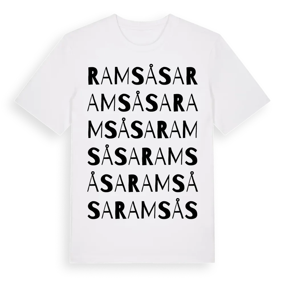 Ramsåsa ordlek t-shirt är inspirerad av byn Ramsåsa i Skåne län, Sverige. Tröjan är designad för dig som har en speciell koppling till platsen – oavsett om du bor här, har rötterna här eller bara älskar Ramsåsa.