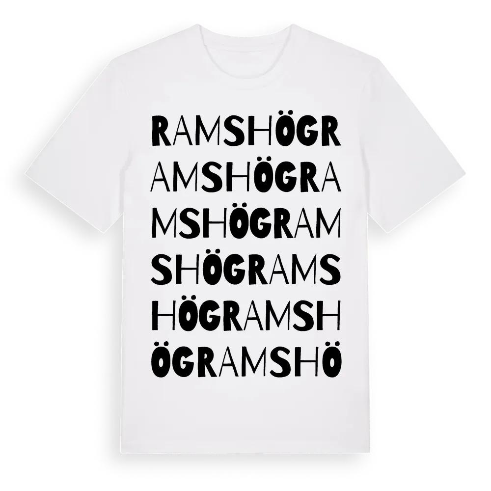 Ramshög ordlek t-shirt är inspirerad av Ramshög i Skåne län, Sverige. Tröjan är designad för dig som har en speciell koppling till platsen – oavsett om du bor här, har rötterna här eller bara älskar Ramshög.