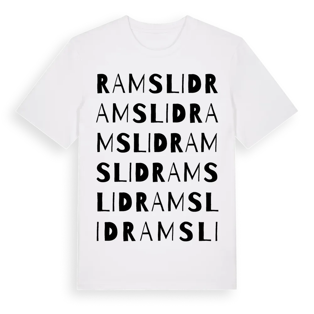 Ramslid ordlek t-shirt är inspirerad av Ramslid i Skåne län, Sverige. Tröjan är designad för dig som har en speciell koppling till platsen – oavsett om du bor här, har rötterna här eller bara älskar Ramslid.
