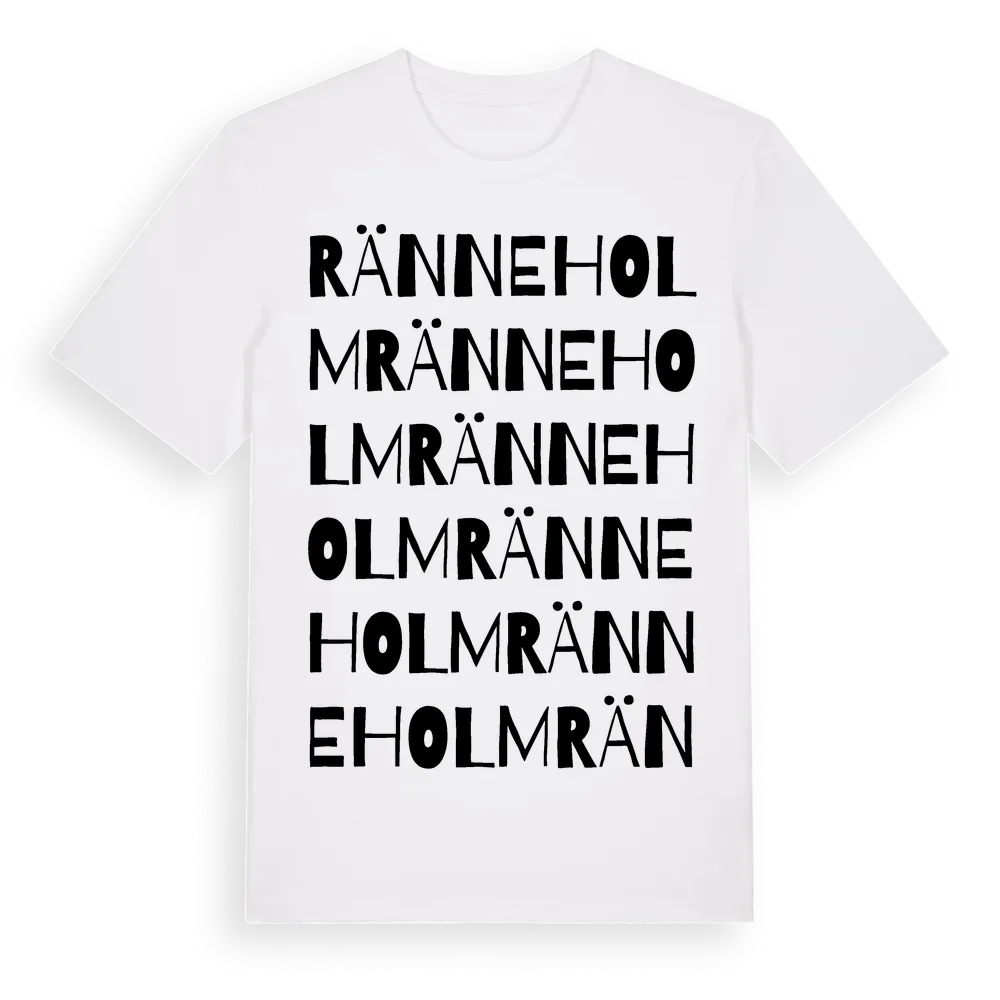 Ränneholm ordlek t-shirt är inspirerad av Ränneholm i Skåne län, Sverige. Tröjan är designad för dig som har en speciell koppling till platsen – oavsett om du bor här, har rötterna här eller bara älskar Ränneholm.