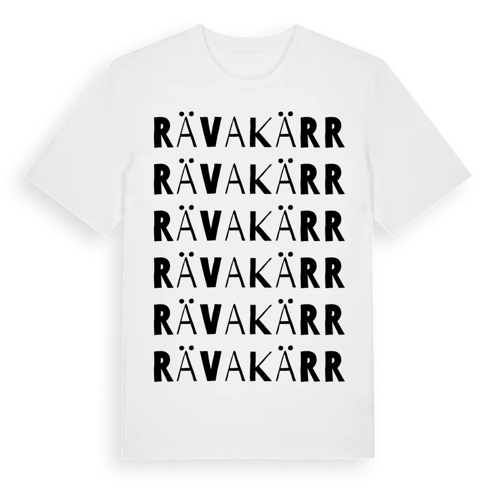En ordlek byggd på Rävakärrs namn. Subtilt och klurig – ett motiv som bara de som verkligen känner platsen fullt ut förstår. Premium bomull, unisex – från Rävakärr i Skåne län.