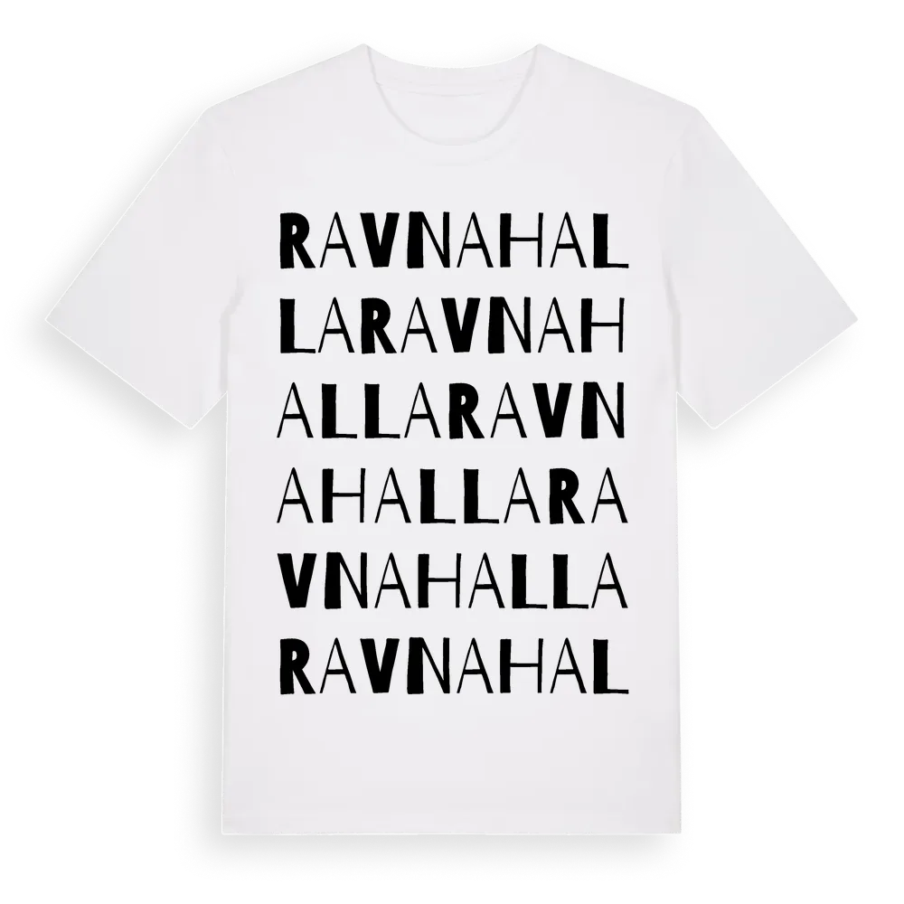 Ravnahalla ordlek t-shirt är inspirerad av byn Ravnahalla i Skåne län, Sverige. Tröjan är designad för dig som har en speciell koppling till platsen – oavsett om du bor här, har rötterna här eller bara älskar Ravnahalla.