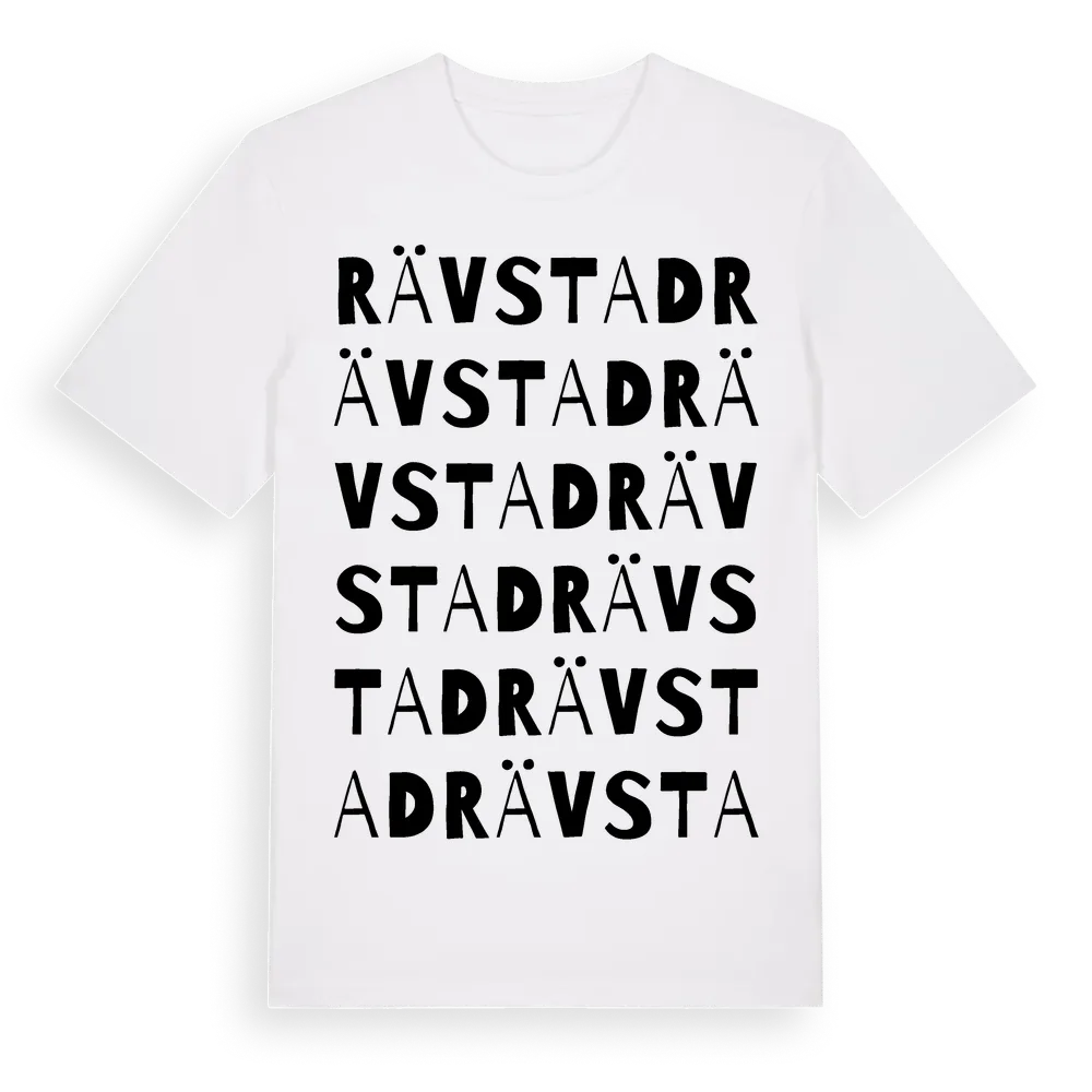 Rävstad ordlek t-shirt är inspirerad av Rävstad i Skåne län, Sverige. Tröjan är designad för dig som har en speciell koppling till platsen – oavsett om du bor här, har rötterna här eller bara älskar Rävstad.