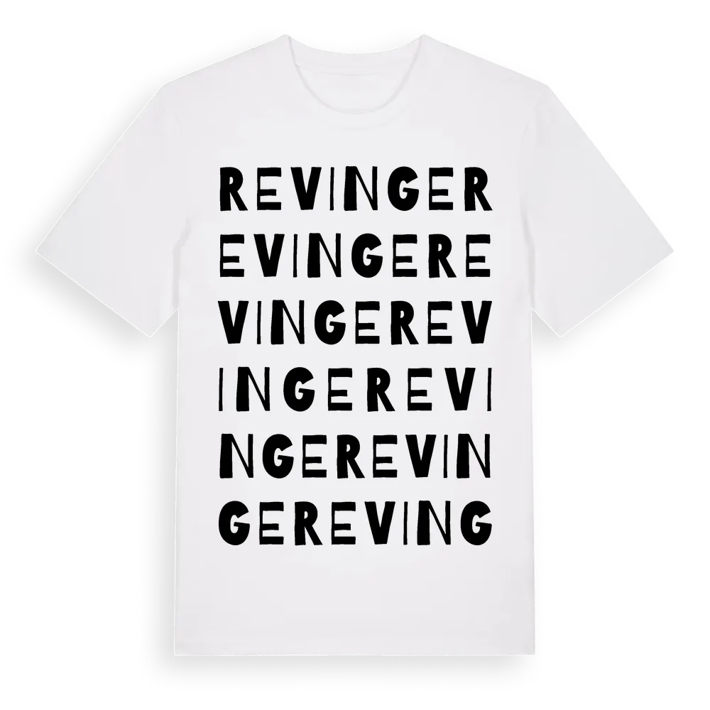 Revinge ordlek t-shirt är inspirerad av byn Revinge i Skåne län, Sverige. Tröjan är designad för dig som har en speciell koppling till platsen – oavsett om du bor här, har rötterna här eller bara älskar Revinge.