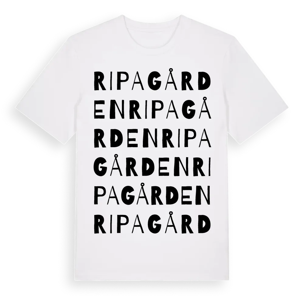 Ripagården ordlek t-shirt är inspirerad av Ripagården i Skåne län, Sverige. Tröjan är designad för dig som har en speciell koppling till platsen – oavsett om du bor här, har rötterna här eller bara älskar Ripagården.