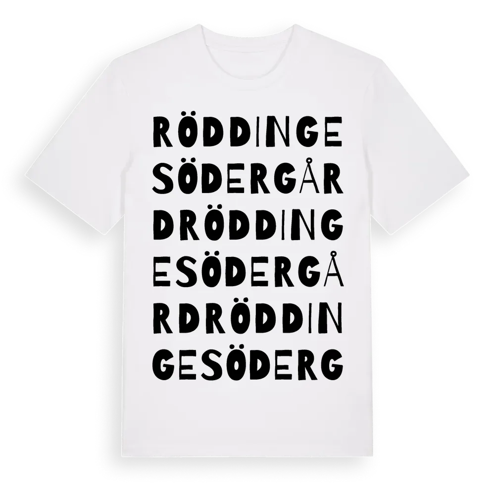 Röddinge Södergård ordlek t-shirt är inspirerad av Röddinge Södergård i Skåne län, Sverige. Tröjan är designad för dig som har en speciell koppling till platsen – oavsett om du bor här, har rötterna här eller bara älskar Röddinge Södergård.