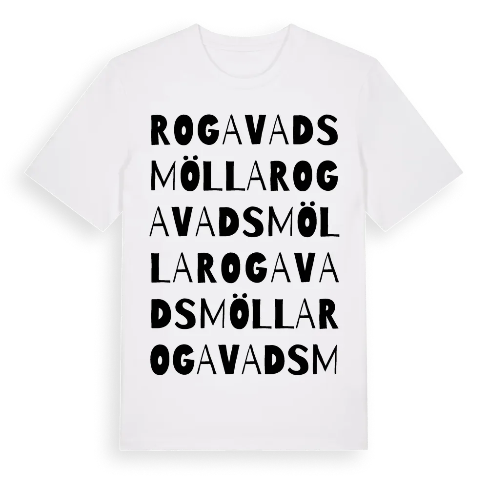 Rogavadsmölla ordlek t-shirt är inspirerad av Rogavadsmölla i Skåne län, Sverige. Tröjan är designad för dig som har en speciell koppling till platsen – oavsett om du bor här, har rötterna här eller bara älskar Rogavadsmölla.