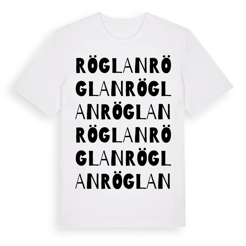 Röglan ordlek t-shirt är inspirerad av byn Röglan i Skåne län, Sverige. Tröjan är designad för dig som har en speciell koppling till platsen – oavsett om du bor här, har rötterna här eller bara älskar Röglan.