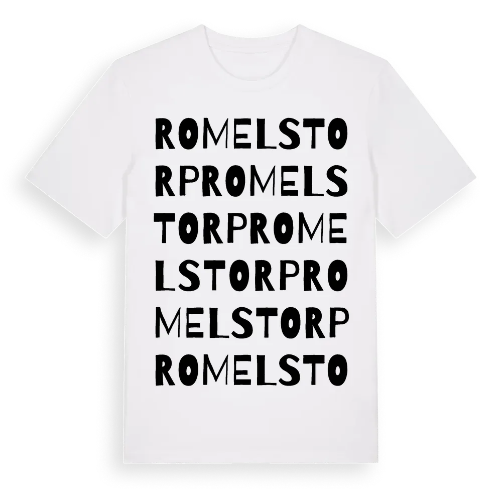 Romelstorp ordlek t-shirt är inspirerad av byn Romelstorp i Skåne län, Sverige. Tröjan är designad för dig som har en speciell koppling till platsen – oavsett om du bor här, har rötterna här eller bara älskar Romelstorp.