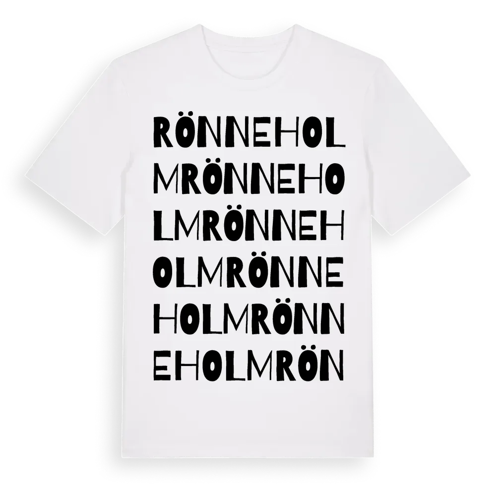 Rönneholm ordlek t-shirt är inspirerad av stadsdelen Rönneholm i Skåne län, Sverige. Tröjan är designad för dig som har en speciell koppling till platsen – oavsett om du bor här, har rötterna här eller bara älskar Rönneholm.