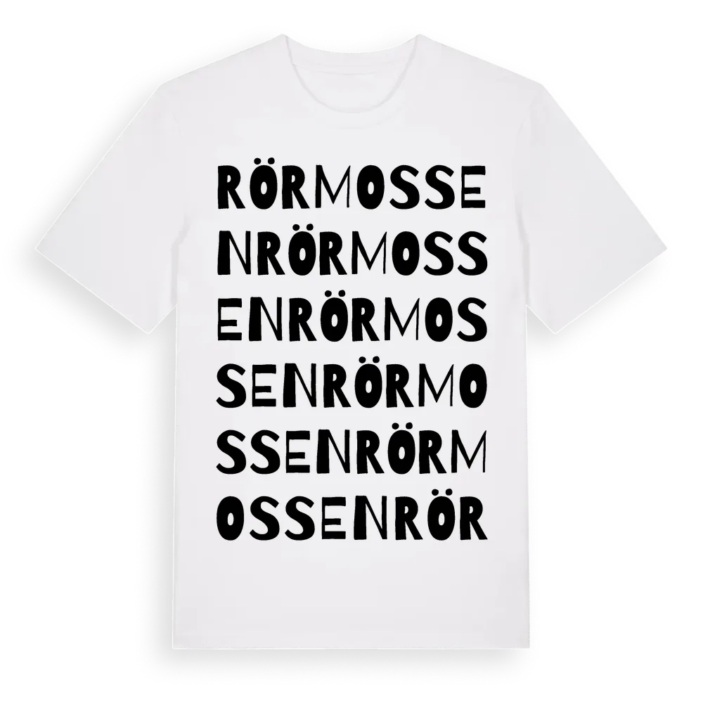 Rörmossen ordlek t-shirt är inspirerad av Rörmossen i Skåne län, Sverige. Tröjan är designad för dig som har en speciell koppling till platsen – oavsett om du bor här, har rötterna här eller bara älskar Rörmossen.