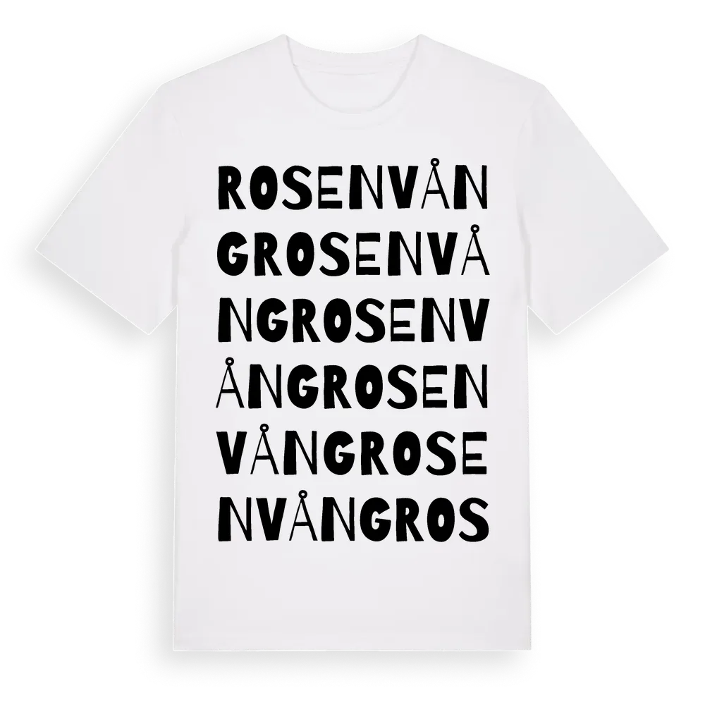 Rosenvång ordlek t-shirt är inspirerad av Rosenvång i Skåne län, Sverige. Tröjan är designad för dig som har en speciell koppling till platsen – oavsett om du bor här, har rötterna här eller bara älskar Rosenvång.
