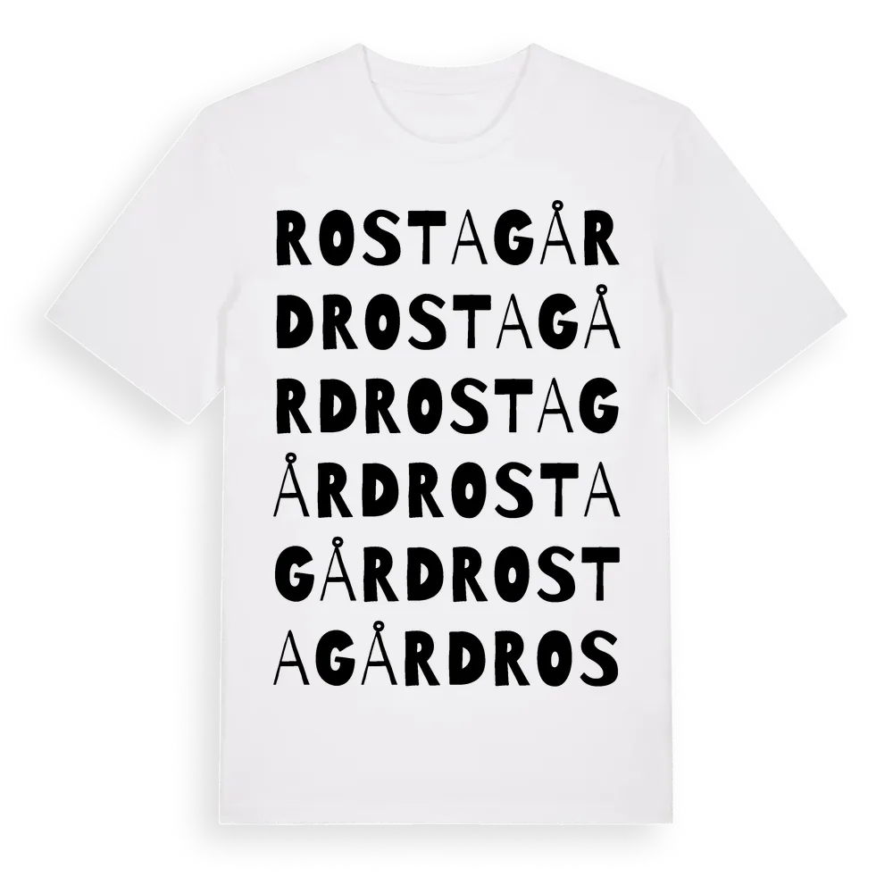 Rosta Gård ordlek t-shirt är inspirerad av Rosta Gård i Skåne län, Sverige. Tröjan är designad för dig som har en speciell koppling till platsen – oavsett om du bor här, har rötterna här eller bara älskar Rosta Gård.