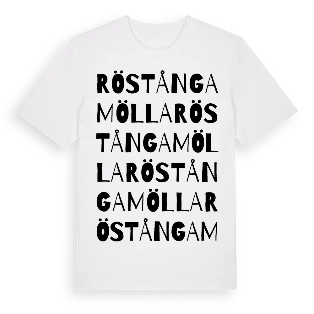 Röstångamölla ordlek t-shirt är inspirerad av byn Röstångamölla i Skåne län, Sverige. Tröjan är designad för dig som har en speciell koppling till platsen – oavsett om du bor här, har rötterna här eller bara älskar Röstångamölla.