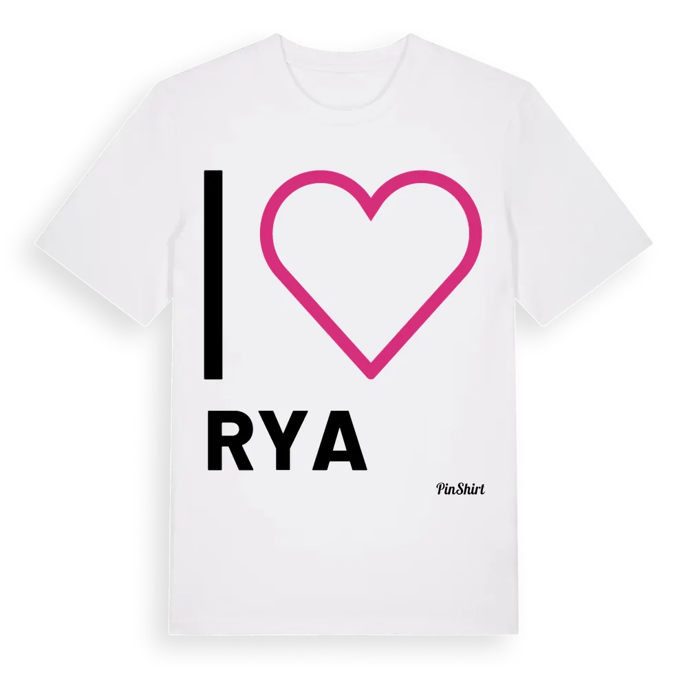 Jag älskar Rya t-shirt stort tryck är inspirerad av Rya i Skåne län, Sverige. Tröjan är designad för dig som har en speciell koppling till platsen – oavsett om du bor här, har rötterna här eller bara älskar Rya.