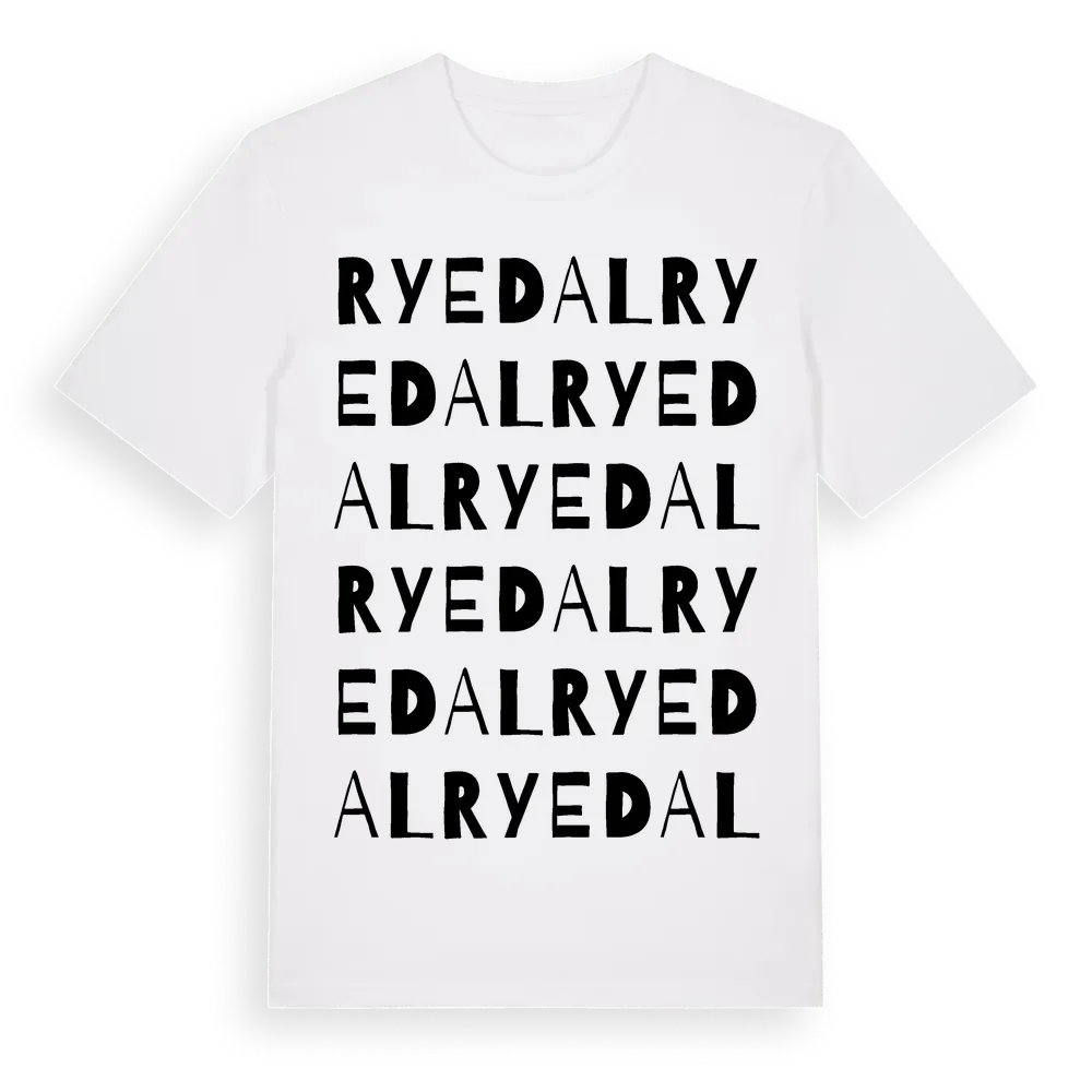 Ryedal ordlek t-shirt är inspirerad av Ryedal i Skåne län, Sverige. Tröjan är designad för dig som har en speciell koppling till platsen – oavsett om du bor här, har rötterna här eller bara älskar Ryedal.