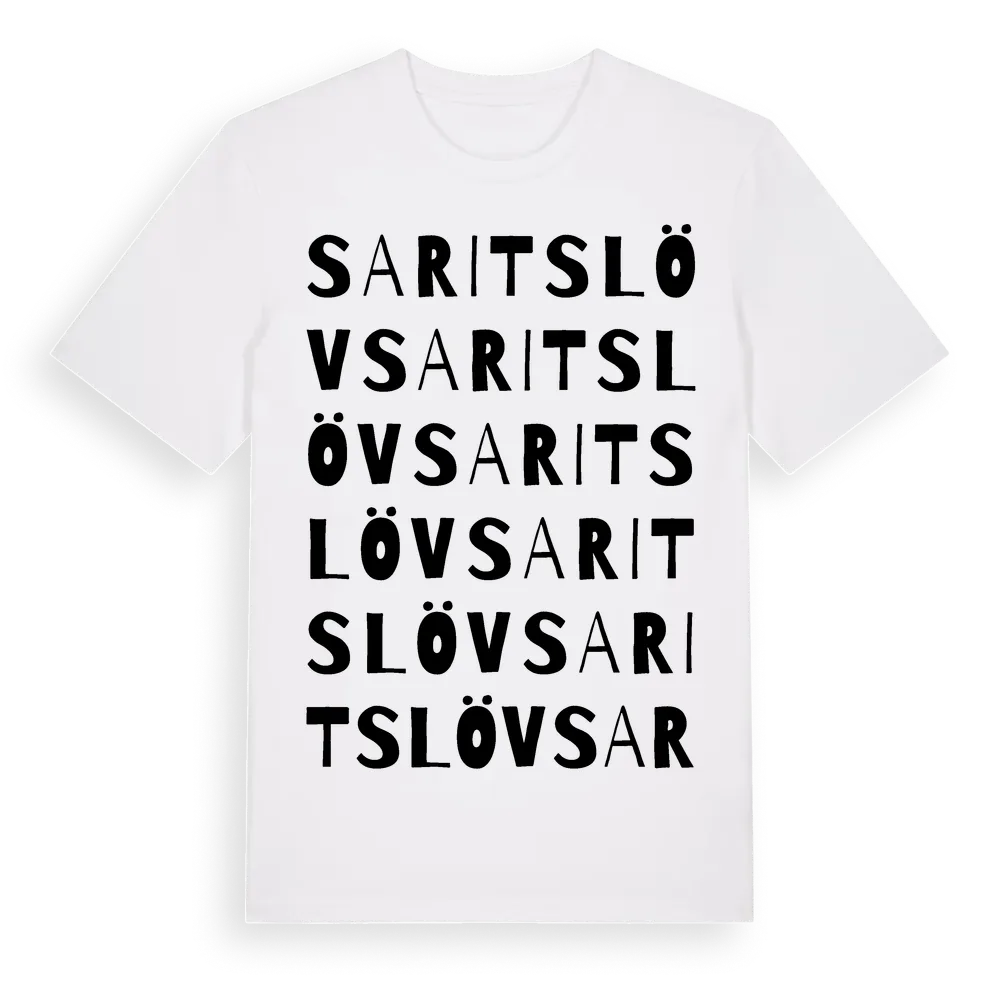 Saritslöv ordlek t-shirt är inspirerad av stadsdelen Saritslöv i Skåne län, Sverige. Tröjan är designad för dig som har en speciell koppling till platsen – oavsett om du bor här, har rötterna här eller bara älskar Saritslöv.