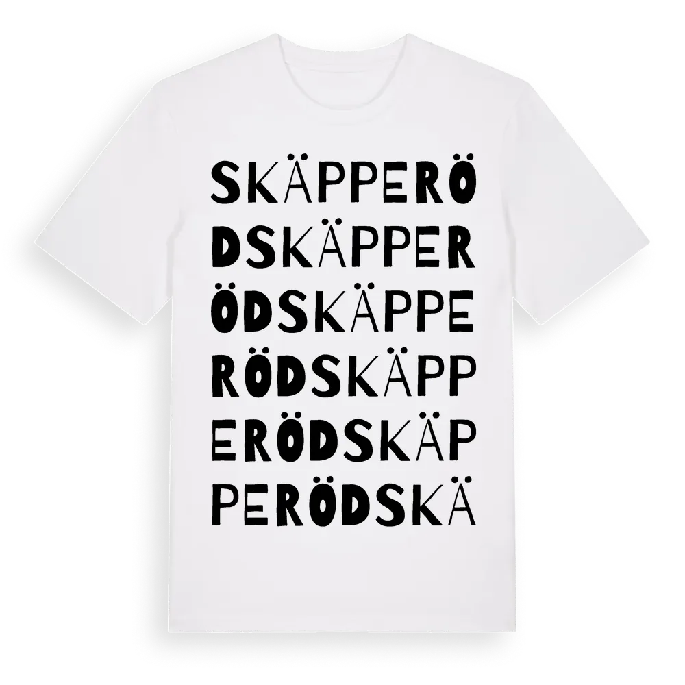 Skäpperöd ordlek t-shirt är inspirerad av byn Skäpperöd i Skåne län, Sverige. Tröjan är designad för dig som har en speciell koppling till platsen – oavsett om du bor här, har rötterna här eller bara älskar Skäpperöd.